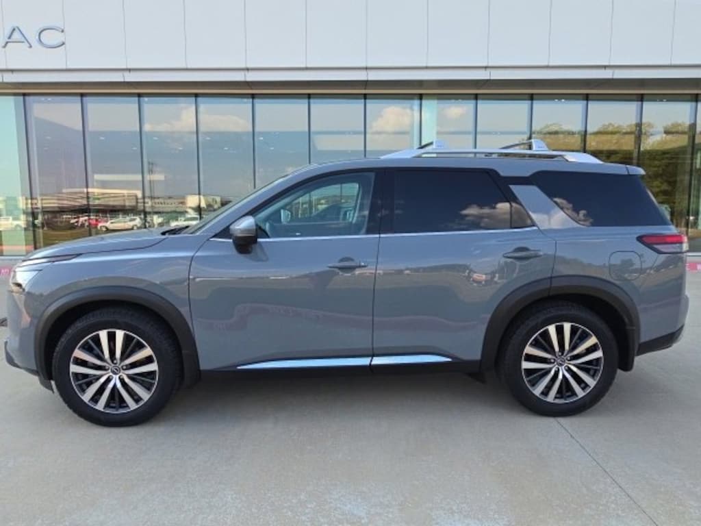 This 2022 Nissan Pathfinder Platinum in Boulder Gray Pearl comes with the following features: V6 9-Speed Automatic FWD Cargo Package (Cargo Area Protector, Cargo Net, and First Aid Kit), Tow Delete Package (Delete Tow Hitch Receiver & Harness), 13 Speakers, 3rd row seats: bench, 4-Wheel Disc Brakes, ABS brakes, Air Conditioning, Alloy wheels, AM/FM radio: SiriusXM, Auto High-beam Headlights, Auto tilt-away steering wheel, Auto-dimming Rear-View mirror, Automatic temperature control, Axle Ratio: TBD, Black Splash Guards (Set of 4), Bodyside moldings, Bose Premium Audio System, Brake assist, Bumpers: body-color, Captain's Chairs Carpeted Floor Mats (Set of 4), Climate Controlled Front Bucket Seats, Cross Bars, Delay-off headlights, Driver door bin, Driver vanity mirror, Dual front impact airbags, Dual front side impact airbags, Electronic Stability Control, Emergency communication system: NissanConnect Services, Exterior Parking Camera Rear, Four wheel independent suspension, Front anti-roll bar, Front Bucket Seats, Front Center Armrest, Front dual zone A/C, Front fog lights, Front reading lights, Fully automatic headlights, Garage door transmitter: HomeLink, Heads-Up Display, Heated door mirrors, Heated front seats, Heated rear seats, Heated steering wheel, Illuminated entry, Knee airbag, Leather steering wheel, Low tire pressure warning, Memory seat, Navigation system: NissanConnect Navigation, NissanConnect w/Navigation & Services, Occupant sensing airbag, Outside temperature display, Overhead airbag, Overhead console, Panic alarm, Passenger door bin, Passenger vanity mirror, Power door mirrors, Power driver seat, Power Liftgate, Power moonroof, Power passenger seat, Power steering, Power windows, Radio data system, Radio: AM/FM Audio System, Rain sensing wipers, Rear air conditioning, Rear anti-roll bar, Rear reading lights, Rear side impact airbag, Rear window defroster, Rear window wiper, Reclining 3rd row seat, Remote keyless entry, Security system, Semi-Aniline Leather Seating Surfaces, Speed control, Speed-sensing steering, Speed-Sensitive Wipers, Split folding rear seat, Spoiler, Steering wheel memory, Steering wheel mounted audio controls, Tachometer, Telescoping steering wheel, Tilt steering wheel, Traction control, Trip computer, Turn signal indicator mirrors, Variably intermittent wipers, Ventilated front seats, and Wheels: 20 Alloy w/Unique Finish.